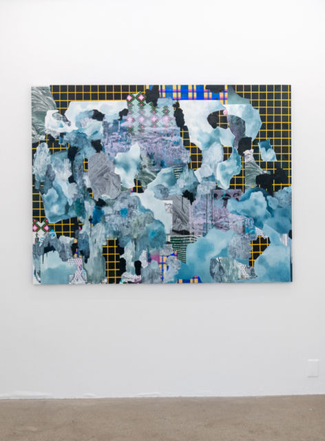 For Flotsam and Jetsam, Taylor used selected details of the choppy sea, rolling waves, and billowing mast from illustrations by Doré, for Samuel Taylor Coleridge’s poem, The Rime of the Ancient Mariner, written in 1797-1798 and illustrated in 1875. The traditional woodblock, carved by hand in the late 19th century, was reproduced in the 1970s for Dover Publications before being scanned, cropped, resized, and repeatedly screen-printed onto canvas. Cut-outs from nature reference books intersect grids as well as the craftwork of crochet tablecloths, beadwork patterns, and other printed ephemera from the artist’s own archive. Themes of nature and culture, craft and technology, traditional and digital media, old and new are collapsed to highlight interconnections and uncouple apparent binaries. Decisions in the painting process are also reversed and “unpainted,” swinging between yes and no, fast and slow. The marine theme was significant to the time Taylor herself spent by the ocean during her residency at 18th St Arts Center, Santa Monica, where these works were produced. Alex Estorick with Diana Taylor.
